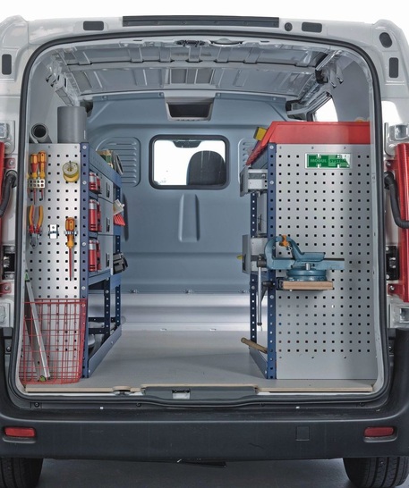 Doch fürs SHK-Handwerk muss ein Branchenfahrzeug mehr bieten als ein spartanisch ausgestatteter Kastenwagen. Um mit Fracht und Handwerkszeug möglichst sicher ans Ziel zu kommen, gilt es, die Utensilien für die Tour zu verstauen bzw. zu verzurren. Fiat hat deshalb in Zusammenarbeit mit dem schwedischen Einrichter Modul-System (in Deutschland ehemals Servicemobil) eine Werkstattausstattung festgelegt, die in die Lang-Version des Scudo eingebaut werden kann. Dazu gehört eine Bodenplatte sowie links und rechts je eine modular aufgebaute 90 cm hohe Einrichtung mit Schubladen, Systemkoffern, Sortimentskästen, Regalen und Staufächern über den Radkästen. Neben der Einrichtung bieten sich zusätzliche Stell- und Staumöglichkeiten, falls die Fahrt zur Baustelle oder der Serviceeinsatz mit einem umfangreichen Sortiment verbunden sein muss.