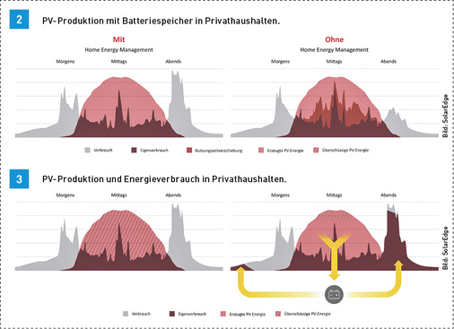 Die Aufnahme von Solarenergie in den Energiemix eines Gebäudes ist ein Baustein für die Erhöhung der Energieunabhängigkeit, aber es ist nur der erste Schritt. Der nächste Schritt besteht in der Optimierung der Energieverwaltung zur Steigerung des Eigenverbrauchs. Das ist notwendig, weil der Energieverbrauch nicht immer mit den Zeiten der Energieerzeugung eines PV-Systems übereinstimmt. Grundsätzlich gibt es zwei Möglichkeiten, dieses Missverhältnis auszugleichen: Energiespeicherung und Nutzungszeitverschiebung. Die Energiespeicherung ist ein wesentlicher Teil des intelligenten Energiemanagements, da hier die Energieproduktion nicht beschränkt werden muss und die erzeugte Energie nicht ins Netz eingespeist, sondern für den Verbrauch zu einem späteren Zeitpunkt gespeichert wird. In PV-Systemen mit Speicher ist der Wechselrichter für die Steuerung der Lade- und Entladevorgänge der Batterie verantwortlich, um den Strombedarf zu decken und den Strombezug aus dem Netz zu reduzieren. Im Bild 2 wird veranschaulicht, wie durch Energiespeicherung der Eigenverbrauch und die Energieunabhängigkeit erhöht werden.