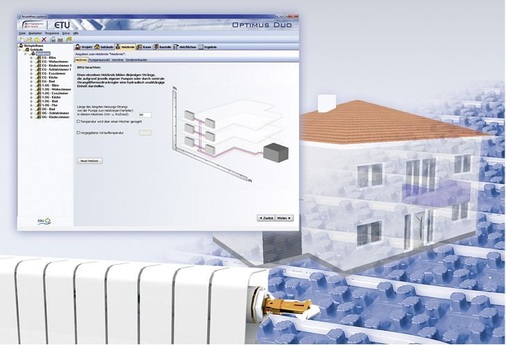 Mit dem Programm Optimus Duo bietet die Software des Kölner Unternehmens Hottgenroth/ETU Software die Möglichkeit, sowohl Heizkörper als auch Fußbodenheizungen hydraulisch abzugleichen. Es werden alle relevanten Gebäude- und Anlagendaten erfasst und die überschlägigen Heizlasten der einzelnen Räume berechnet. Darauf aufbauend ermittelt die Anwendung die günstigsten Werte für Vorlauftemperatur sowie Pumpen- und Thermostatventileinstellungen des Heizsystems. Anhand dieser Daten kann der hydraulische Abgleich durchgeführt und nachgewiesen werden. Die Ergebnisse können ausgedruckt und für KfW- und BAFA-Anträge zur Kreditvergabe genutzt werden.