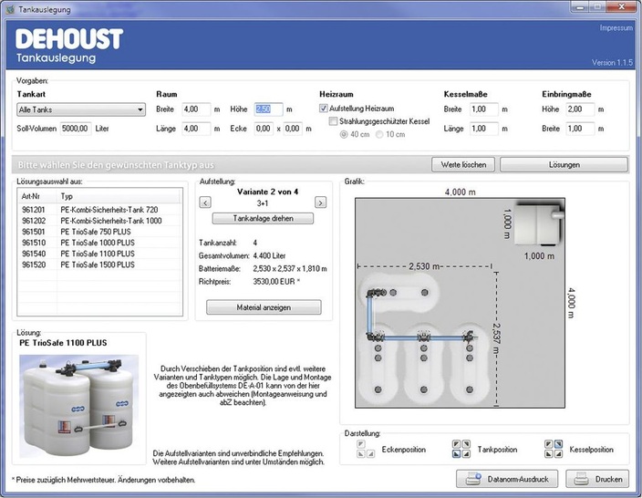 Die möglichen Aufstellvarianten und die erforderlichen Wandabstände – auch in Abhängigkeit des Deckenabstandes – können mit dem Tankauslegungsprogramm von Dehoust leicht simuliert werden. Ausdrucke über den Materialbedarf und die Tankanordnung im Raum mit und ohne Feuerstätte erleichtern die Montage.