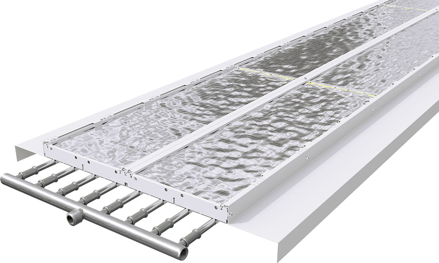 Das geringe Gewicht der Deckenstrahlplatten verringert die Dachlast und erleichtert die Montage erheblich. Alle Bauteile von Zehnder ZFP sind komplett verzinkt und damit korrosionsgeschützt, was eine besonders lange Lebensdauer zur Folge hat. Der kleine Rohrdurchmesser und die geringen Rohrabstände verbessern außerdem die Systemleistung bei Niedertemperatursystemen, wie beispielsweise Wärmepumpen, und tragen zu einem filigraneren Design bei. In der perforierten Ausführung überzeugen die Deckenstrahlplatten zudem durch effektive Schallabsorption.