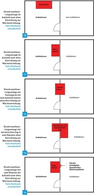 Warmluftschwerkraftheizungen besitzen hingegen ein Wärmeverteilsystem, bestehend in der Regel aus Leitungen oder Schächten, beginnend von der Heizkammerdecke der Feuerstätte bis hin zu den entsprechenden Warmluftauslässen in den einzelnen Räumen. Dies gilt sinngemäß auch für Feuerstätten mit Wasserwärmeübertrager. Die Bilder 10 bis 19 verdeutlichen nochmals, wann ein Nachweis erforderlich ist oder nicht.