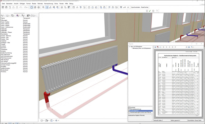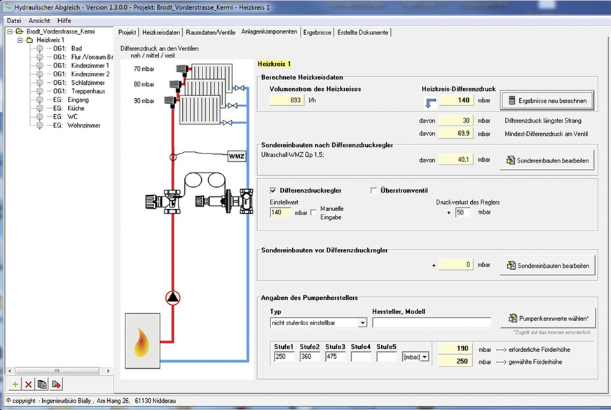 Allerdings setzen diese Programme CAD-Kenntnisse voraus und eignen sich insbesondere für (neu geplante) große, komplexe Anlagen. Werden diese damit geplant, sind ein hydraulischer Abgleich und andere Berechnungen quasi inklusive. Berechnet werden neben Voreinstellwerten auch Pumpen-Volumenströme, Rohrdimensionen, Druckverluste, Strömungsgeschwindigkeiten und andere Daten.