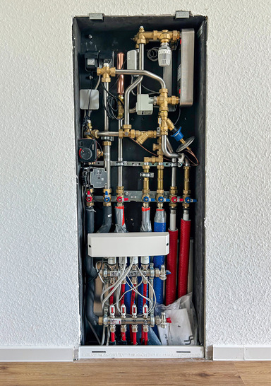 Auch für die Wärmeverteilung bietet das System Vorteile. Die kompakten, montagefertigen Stationen benötigen lediglich drei Leitungen: Heizvorlauf, Heizrücklauf und Kaltwasser. Das reduziert nicht nur den Platzbedarf in den Schächten, sondern auch den Aufwand für Material und Installation. Die Bauabläufe profitieren ebenfalls, da zunächst nur der Schrank mit Kugelhahnleiste im Rohbau installiert wird, während die eigentliche Station erst in der Ausbauphase folgt.