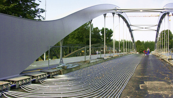 Mit dieser unkalkulierbaren Gefahrenlage ist es jetzt vorbei. Mehr noch: Eine neue Kanalbrücke – errichtet neben der historischen – ist zu einem technischen Vorbild für Brücken geworden, wo ähnliche Witterungs- und Naturbedingungen das Autofahren zum Risiko machen. Im November vergangenen Jahres wurde nach mehr als zweijähriger Planungs- und Bauzeit die erste Brücke in Deutschland freigegeben, deren Fahrbahn mit Erdwärme beheizt wird. Im Sommer wird sie zudem mit derselben Wärmepumpentechnik gekühlt, um zum Beispiel die Spurrillenbildung bei Hitze einzudämmen. Mess- und Steuerungstechnik sorgen bei dieser Konstruktion automatisch für den Einsatz der geothermischen Anlage.