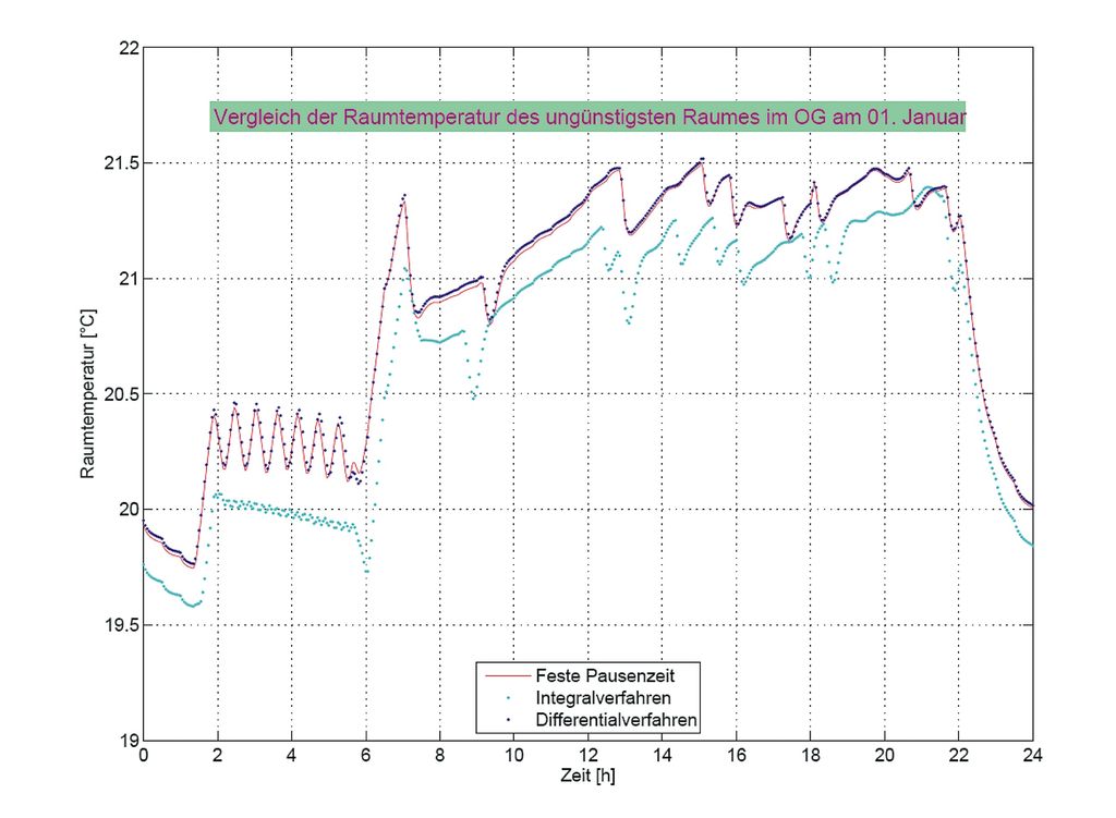 Im Rahmen einer Langzeitstudie wurden sowohl durch Messreihen an praktisch ausgeführten Anlagen als auch durch rechnerische Simulationen die Auswirkungen der Pausenzeit nach dem Integralverfahren und nach dem Differenzialverfahren miteinander verglichen. Für die computergestützte Simulation kamen die Simulationsprogramme Matlab/Simulink und Trnsys zur Anwendung. Die Kombination beider Programme ermöglicht die umfassende Systemanalyse.