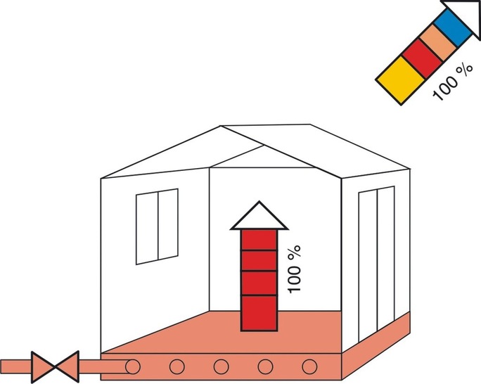 Wie in Bild 2 dargestellt, muss die Heizlast, die der Raum laufend an seine kältere Umgebung verliert, dem Raum auch laufend (zu 100 %) über die Heizfläche wieder zugeführt werden.