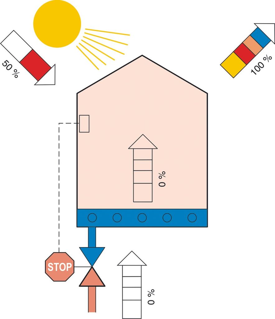 In Bild 14 gelten die gleichen Randbedingungen wie zuvor, jedoch entsteht ein Fremdwärme-Eintrag durch Sonneneinstrahlung. Der Raumthermostat schließt, reduziert somit die Wärmezufuhr an die Boden-Heizfläche (Energieeinsparung). Die durch den Bypass zirkulierende Restwassermenge reicht jedoch aus, um den Boden nicht komplett auskühlen zu lassen. Dadurch wird der Komfort erhöht. Nach Beendigung der Sonneneinstrahlung ist die Wiederaufheizphase kürzer.
