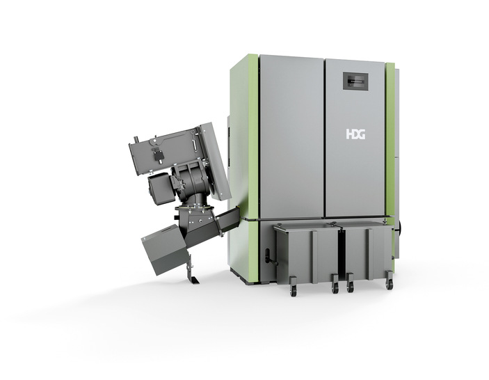 Das HDG Entaschungssystem ist nun auch ab Werk serienmäßig ohne Aufpreis im Kessel integriert. Optional ist ein externer Aschenbehälter mit 230 Liter Füllvolumen verfügbar, der auch über einen Frontlader mit Euro-Aufnahme entleert werden kann. Die sehr leise Betriebsweise ist ein weiteres Merkmal dieser effizienten Anlage
