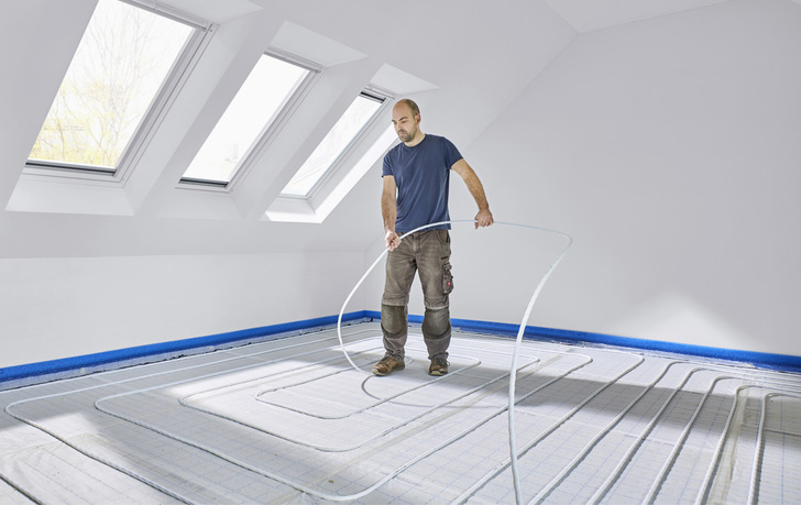 Uponor Klett Silent ist Teil des Produktspektrums des Fußbodenheiz- und Kühlsystems Uponor Klett und lässt sich ohne weiteres Zubehör und sogar allein montieren. Die mit einem Klettband umwickelten Rohre kann der Installateur schnell, einfach und zuverlässig mittels leichtem Fußdruck auf der Verlegeplatte mit integrierter Steinwolldämmung fixieren – ein aufgedrucktes Verlegeraster dient dabei als Orientierung. Korrekturen sind jederzeit möglich. Das System ist somit nicht nur nachhaltig, sondern auch äußerst flexibel.