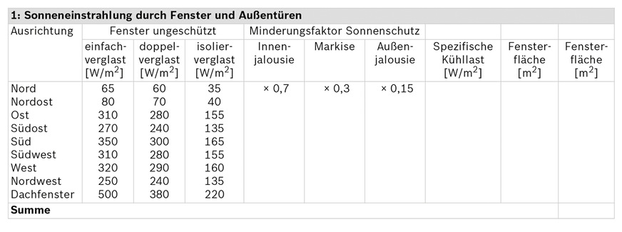 Zunächst wird die Ausrichtung der einzelnen Fenster und Türen bestimmt. Aus der Tabelle lässt sich, abhängig von der Verglasung, die durch Sonneneinstrahlung eingebrachte zugehörige Leistung in W/m² ablesen. Bei Bedarf wird mit einem Minderungsfaktor Sonnenschutz multipliziert, es ergibt sich die spezifische Kühllast. Diese wird im letzten Schritt mit der jeweiligen Fensterfläche in Quadratmetern multipliziert. Die einzelnen Beträge werden zur Summe addiert.