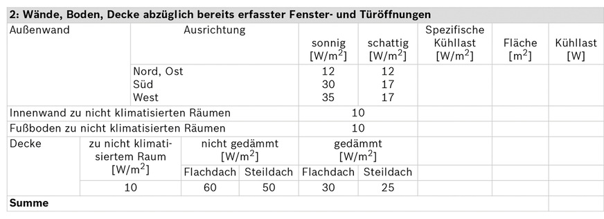 Gemäß VDI 2078 lässt sich die Kühllast genau berechnen. Alternativ bieten manche Hersteller Formblätter zur überschlägigen Berechnung an, angelehnt an die VDI 2078. Buderus liefert in den Planungsunterlagen für seine Luft/Wasser- und Sole/Wasser-Wärmepumpen einen Vordruck mit, der sich einfach ausfüllen lässt. → www.buderus.de/technische-dokumentation