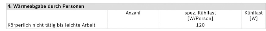Halten sich regelmäßig Personen im zu kühlenden Raum auf, beeinflusst das ebenfalls die Raumtemperatur. Nach VDI-Richtlinie 2078 gibt eine Person bei einer Umgebungstemperatur von 20 bis 23 °C etwa 120 W Wärme ab. Angenommen wird hier eine nicht körperliche bis leichte Arbeit. In großen Büros kann der Einfluss durch viele Personen entsprechend höher sein.