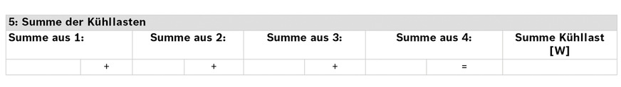 Zu guter Letzt werden die ermittelten einzelnen Kühllasten summiert, das Ergebnis ist die gesamte Kühllast in Watt. Dieser Wert ist einer von mehreren, die für die Auslegung einer Wärmepumpe relevant sind, die außer der Wärmeerzeugung auch kühlen soll.