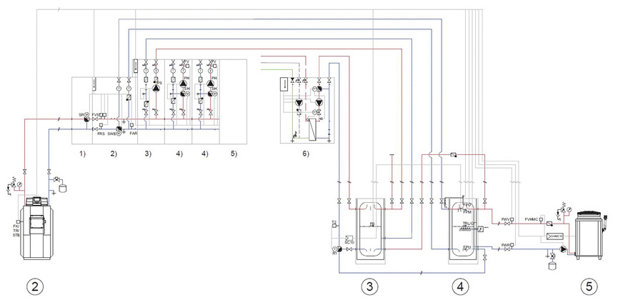 Das im Regelgerät enthaltene Funktionsmodul FM-CM ermöglicht diese Strategie-Pufferfunktion. Der zentrale Pufferspeicher versorgt die Wohnungsstationen. Ein ungemischter Heizkreis gewährleistet, dass die gewünschte Netzversorgungstemperatur eingehalten wird.