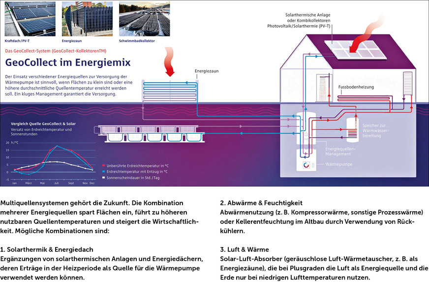 Dass die Nutzung der Erdwärme auch ohne Tiefenbohrungen funktioniert, verdeutlichen Projekte der GeoCollect GmbH, Chemnitz, auf der Basis von oberflächennahen Erdwärmekollektoren. In mehr als 1000 Anlagen habe dieses Konzept seine Leistungs- und Funktionsfähigkeit bewiesen, so Vertriebsleiter Volkmar Frotscher. Er sieht in Multiquellensystemen eine Möglichkeit, mit weniger Grundfläche höhere Leistungen zu erreichen. Am Beispiel eines realisierten Projektes in Lüneburg erklärt Frotscher, dass durch eine Kombination von GeoCollect-Erdwärmekollektoren und Energiezaun eine nahezu 100 % erneuerbare Energieversorgung auch im nicht sanierten Gebäudebestand möglich ist. Im vorliegenden Fall wurden die Erdkollektoren so angeordnet und verschaltet, dass ein leistungsfähiger Pendelspeicher entsteht. Auch PVT- oder thermische Solarkollektoren könnten in ein solches System eingebunden werden. Wichtig bei Anlagen dieser Größenordnung seien eine sorgfältige Planung der Hydraulik (Tichelmann, innovative Hydraulikmodule) und ein temperaturgeführtes Quellenmanagement. Der Vorteil gegenüber Luft/Wasser-Wärmepumpen seien durchschnittliche Jahresarbeitszahlen zwischen 4,6 und 5,6, keine optische und akustische Belästigung sowie eine nahezu kostenlose sommerliche Gebäudetemperierung.