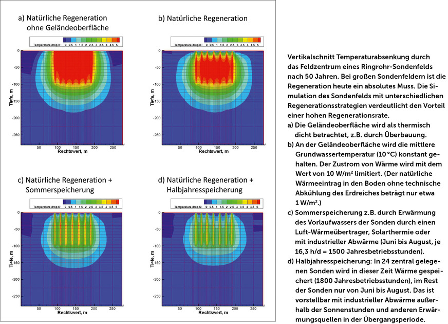 Sie sagt: „Durch eine gezielte Einbindung von Solarthermieanlagen, Luft/Sole-Wärmeübertragern und/oder Trockenkühlern könnten bis zu 35 % an Antriebsenergie für die Wärmepumpe eingespart werden.“ Im Idealfall sollte bei Erdsondenfeldern die zweite Wärmequelle von Anfang an eingeplant werden, weil dadurch auch teure Bohrmeter entfallen. Am Beispiel einer Quartiersversorgung mit 168 Erdwärmesonden in Verbindung mit einem Luftkühler liefert Singer den Nachweis, dass mit der Einbindung einer externen Wärmequelle rund 50 % der Netto-Investitionskosten (bezogen auf die Wärmequelle) und rund 30 % an Heizkosten über einen Zeitraum von 25 Jahren eingespart werden können. Der Markt habe auf den Trend zu Multiquellen-Wärmepumpenanlagen bereits reagiert und biete fertige Zusatzmodule für Sole-Wärmepumpen an, beispielsweise den Terra-Booster der ATF GmbH aus Schönaich. In jedem Fall sollten Erdwärmesondenanlagen im Heiz- und Kühlbetrieb gefahren werden, denn dies sei die einfachste Möglichkeit der Regeneration des Untergrunds, so Singer.