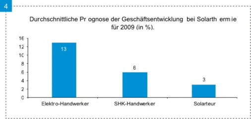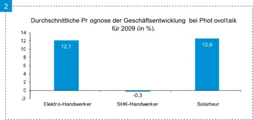 Die PV-Aktiven, bei denen der PV-Anteil am Gesamtumsatz bei durchschnittlich 15 % liegt, erwarten für 2009 ein Wachstum von 12 %. Die aktuellen Meldungen aus dem SHK- und Elektro-Großhandel und von einigen Herstellern, die sich auf den Vertriebskanal Handwerk spezialisiert haben, bestätigen die Einschätzung der Handwerker.