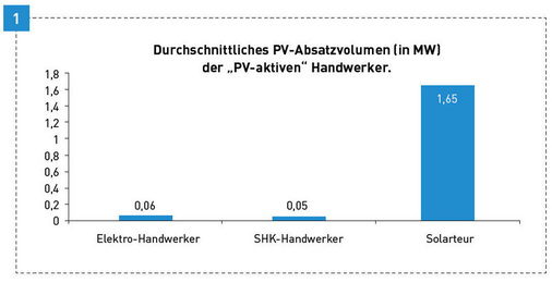 - Querschiesser verwaltet ca. 38 000 aktive SHK-Handwerker in seiner Handwerker-Datenbank. Aus den Dauerbefragungen zu den Produktgruppen im Bereich der erneuerbaren Energie ist bekannt, dass davon ca. 14 % „PV-aktiv“ sind. Deren durchschnittliches Absatzpotenzial beträgt 0,05 MWp. Daraus ergibt sich ein Gesamtabsatzvolumen im Vertriebskanal SHK-Handwerk von ca. 266 MW (Bild 1).