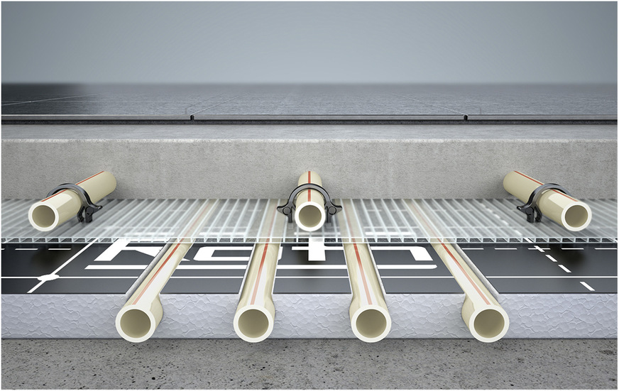 Für die Installation von Flächen-Heiz- und Kühlsystemen in Durchgangsräumen hat Roth die Floorfix Systempakete im Programm. Die Aufbaukonstruktion ermöglicht die sichere Einbettung von Zuleitungen für Heizkreise angrenzender Räume sowie die einfache Installation des Heizkreises für den betreffenden Raum. Dafür kommt die Roth Floorfix-Faltplatte zum Einsatz. Ihre Transparenz erlaubt eine Rohrfixierung mit der Tacker-Verlegetechnik, ohne die darunterliegenden Rohre zu berühren.