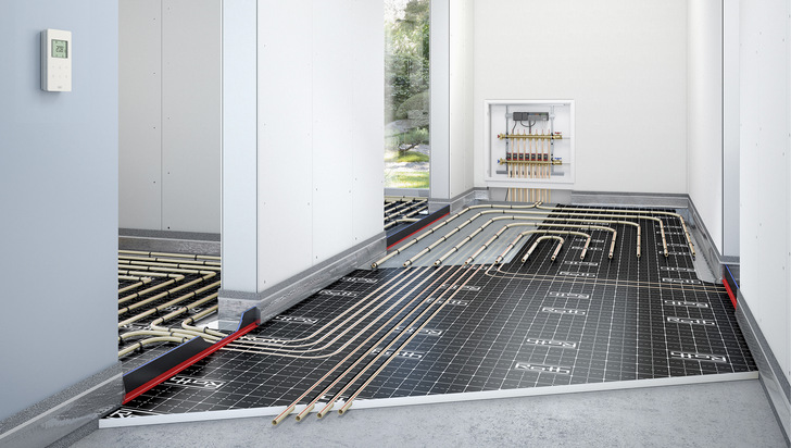 In Nebenräumen wie Hausfluren sind häufig die Heizkreisverteiler installiert und viele Zuleitungen für Heizkreise zu anderen Räumen durchlaufen sie. Um diese Räume vor Überhitzung zu schützen und gleichzeitig einen separat regelbaren Heizkreis zu installieren, eignet sich der Bodenaufbau mit Roth Floorfix. Das System gewährleistet eine kontrollierte Wärmeabgabe und die Regelbarkeit der Raumtemperatur von Durchgangsräumen. Diese muss der Installateur gemäß GEG 2020 § 63, Absatz 1, sicherstellen. Demnach unterliegen Räume mit mehr als sechs Quadratmeter Nutzfläche der Einzelraumregelungspflicht.