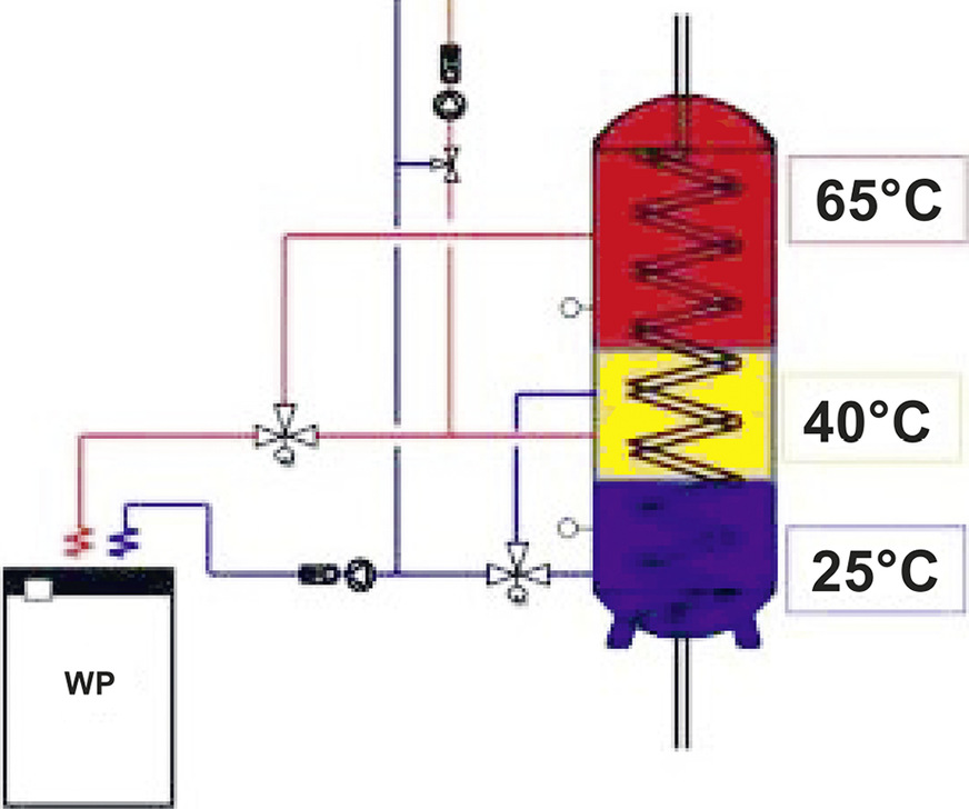 Im Bedarfsfall wird der technische Speicher entweder in Reihe oder parallel ins Heizsystem eingebunden. Beim Parallelpuffer (Bild B) kommt es zu Mischvorgängen. Abhängig vom Verhältnis des Volumenstroms im Wärmepumpenkreis zum Volumenstrom im variablen Verbraucherkreis wird entweder die Wärme auf einem höheren Temperaturniveau erzeugt, als sie am Verbraucher ankommt. Oder das Temperaturniveau im Rücklauf vom Heizkreis wird durch Mischen im Speicher für die Wärmeerzeugung angehoben. Der große Vorteil des Parallelspeichers ist, dass er den Mindestvolumenstrom durch den Verflüssiger sicher gewährleistet – unabhängig von der Hydraulik der Wärmeverbraucher. Hochdruckstörungen sind nahezu ausgeschlossen.