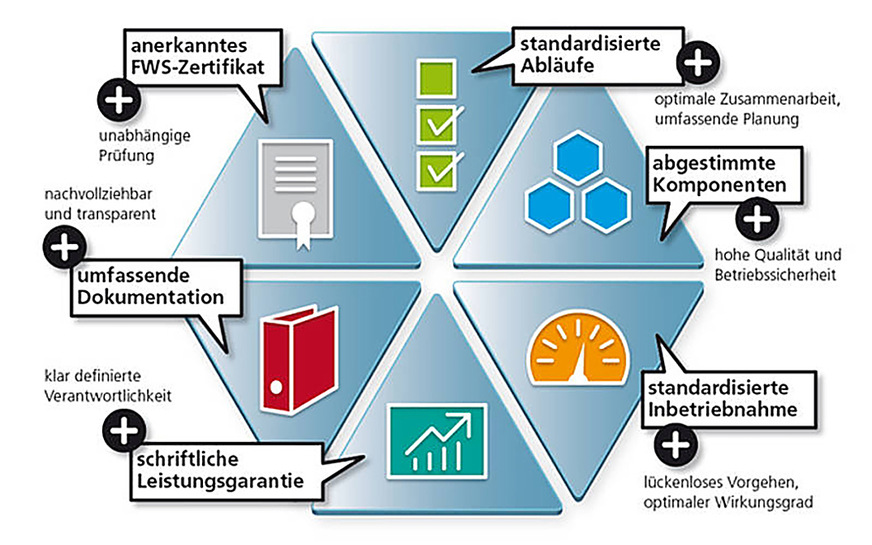 Das Zertifikat gibt vor, dass bei Berechnung und Auslegung der Wärmepumpenanlagen standardisierte Abläufe eingehalten werden und die Hersteller abgestimmte Komponenten verwenden. Auch die Inbetriebnahme einer Wärmepumpenanlage erfolgt nach standardisierten Vorgaben. Nach Abschluss der Installationsarbeiten reicht der Installateur seine Berechnungen an die neutrale Prüfstelle des FWS ein, die auf Basis dieser Unterlagen ein Anlagenzertifikat erstellt und dieses an den Bauherrn weitergibt.