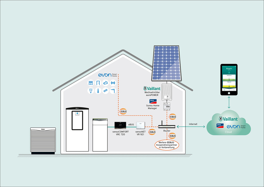 Das unten dargestellte System zeigt, wie mehrere Komponenten im Heimnetzwerk über EEBUS verbunden sind. Das Wärmepumpensystem von Vaillant kann unter anderem die aktuelle Leistungsaufnahme melden und Energiemanagementfunktionen für mehr