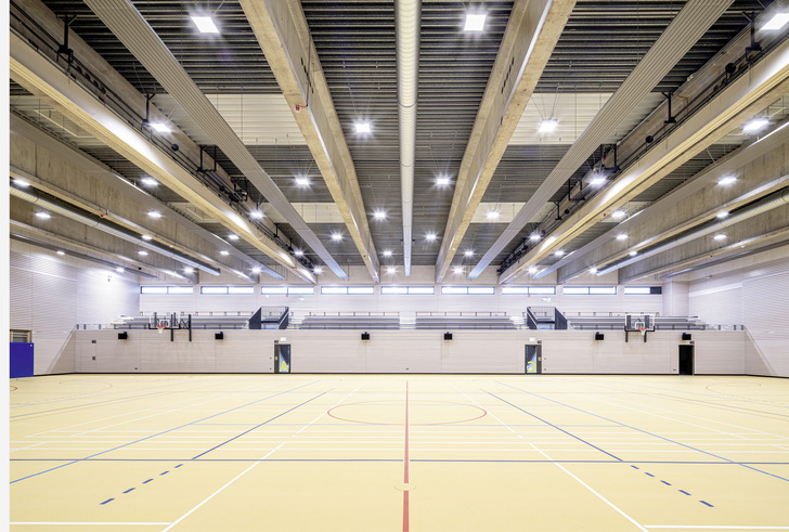 Nachdem der Neubau im Sommer 2021 bezogen werden konnte, begannen kurz danach die umfangreichen Sanierungsarbeiten an der alten Riedhalle in Steinheim. Der Altbau wurde bis auf den Rohbau zurückgebaut, also komplett entkernt. Danach wurden neue Fassaden, neue Fenster und Verglasungen, neue Bodenhülsen für die Sportgeräte sowie ein neuer Sportboden eingebaut. Auch die Toilettenanlage erhielt einen neuen Bodenaufbau und neue Fliesen. Ein zentraler Teil der Sanierung bestand auch in der Schließung der Oberlichter, denn ohne diese wäre es durch die sehr gute Dämmung bei Sonneneinstrahlung zu einer starken Hitzeentwicklung in der Halle gekommen. Des Weiteren fand ein Rückbau der abgehängten Decke statt, um die Deckenkonstruktion zu entlasten. Die mittlerweile marktreife Deckenstrahlplattengeneration Zehnder ZFP leistete hierbei durch ihr geringes Gewicht einen wichtigen Beitrag zur Statik. Insgesamt wurden im Zuge der Sanierung sechs Bänder mit Deckenstrahlplatten Zehnder ZFP à 30 m Länge und 75 cm Breite in der alten Riedhalle installiert, was sich auf eine Fläche von 175 m² beläuft. Zusätzlich bekam das zum alten Teil des Sportkomplexes gehörende Foyer vier Bänder Deckenstrahlplatten Zehnder ZFP inklusive Revisionsblechen.