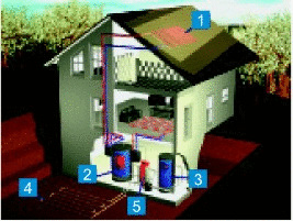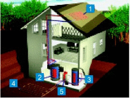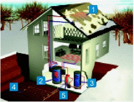 1 Kollektoren 2 HSK-Speicher 3 Vorwärmer 4 Erdkollektor 5 Wärmepumpe