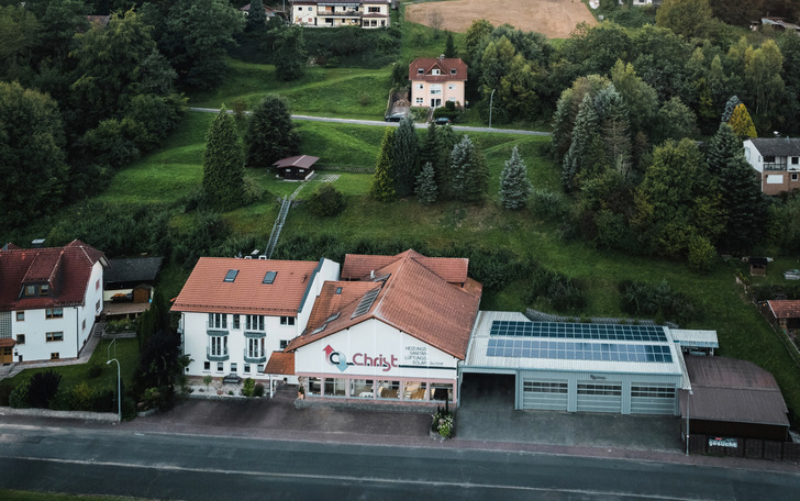 Als Hauptwärmeerzeuger im Gebäude des Handwerksbetriebs Christ in Jossgrund dient eine Wärmepumpe, die sowohl solar unterstützt als auch mit fossiler Brennwerttechnik arbeitet. Die Systemlösung versorgt unterschiedlich genutzte Gebäudeteile mit stark schwankenden Lasten. Das Wohn- und Geschäftsgebäude mit Büro-, Ausstellungs- und Lagerbereichen hat rund 500 m² beheizte Wohnfläche. Diese entfällt zu rund zwei Dritteln auf das Mehrgenerationenhaus der Handwerksfamilie und der Rest auf die Büroräume des Familienbetriebs. Bei Bedarf müssen neben der Wohnfläche etwa 100 m² Ausstellungsfläche im Erdgeschoss sowie bei sehr kalten Wetterlagen zusätzlich eine 300 m² große Lagerhalle beheizt werden.