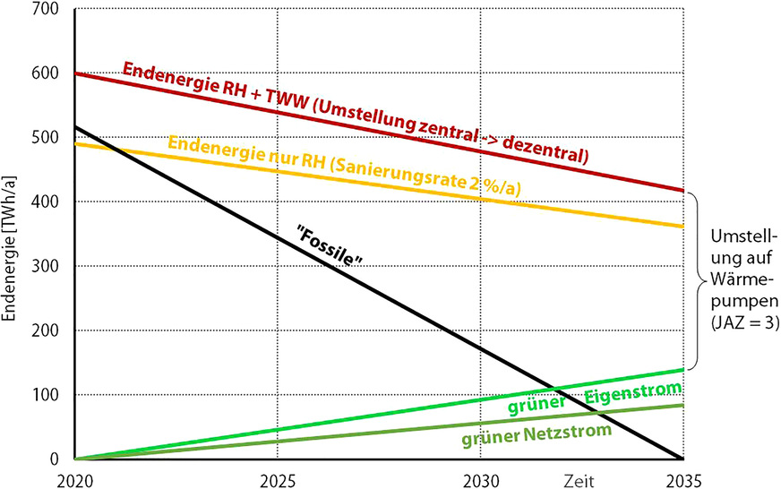 – Endenergieverbrauch 2020 für Raumheizung (RH: 490 TWh/a) und Trinkwarmwasser (TWW: 110 TWh/a) inkl. Aufwand für Erzeugung, Speicherung und Verteilung – davon 86 % überwiegend fossile Energien – vereinfacht lineare Degression bis 2035 auf 417 (RH + TWW) bzw. 362 TWh/a (nur RH) durch Modernisierung und Sanierung: Instandhaltungsmodernisierung.