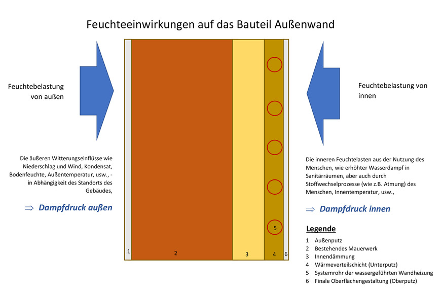 Die häufig angeführte Argumentation, dass der Betrieb einer Wandheizung das etwaige Trocknungsverhalten im Bauteil doch begünstige und deshalb der Feuchteschutz unproblematisch sei, mag schon stimmen. Dies gilt aber nur, wenn die Wandheizung in Betrieb ist. Allerdings muss die Funktion der Außenwand hinsichtlich des Feuchteschutzes auch gewährleistet sein, wenn das nicht der Fall ist. Selbst wenn in vielen Fällen eine nachweisfreie Konstruktion möglich ist, gilt es, auch diese Nachweisfreiheit zu belegen. Dafür sind grundlegende Kenntnisse zum Feuchtetransport in Außenwänden nötig.