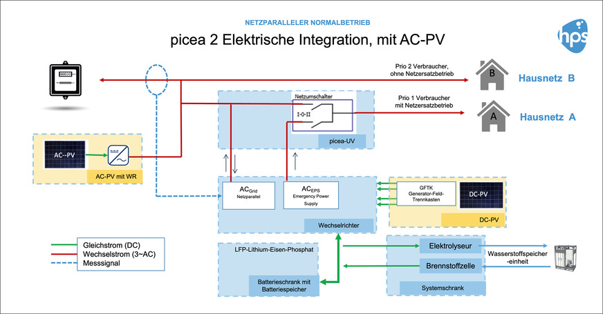 Das vereinfachte Schaltbild der Gesamtanlage weist zwei Ausgänge auf, die mit den Buchstaben A und B gekennzeichnet sind. Der primäre Ausgang A verfügt über eine Notstromfunktion. Der Ausgang A ist im Normalfall auf das Stromnetz geschaltet. Bei einem Ausfall des Stromnetzes schaltet die Unterverteilung auf den inselfähigen Netzersatzstromausgang des Wechselrichters um. Das Haus wird dann mit Netzersatzstrom versorgt. Der Strom an diesem Ausgang ist – auch wenn das Stromnetz funktioniert – auf 63 Ampere begrenzt. Am Ausgang B kann unbegrenzt Leistung aus dem Netz gezogen werden, die 63-Ampere-Grenze gilt hier nicht. Der Ausgang B bietet jedoch keine Netzersatzfunktion. Der Verbrauch beider Ausgänge wird gleichermaßen am Stromrichtungssensor erfasst und aus dem netzparallelen Ausgang des Wechselrichters versorgt. So steht der offizielle Stromzähler still und der Strombedarf des Haushalts wird von Picea gedeckt. Der Picea-Wechselrichter kann bis zu 15 kW einspeisen, um den mit dem Stromrichtungssensor gemessenen Verbrauch des Hauses zu kompensieren. Hierfür stehen ihm die Leistung der Picea-Batterie sowie die Leistung der DC-PV und der Brennstoffzelle zur Verfügung. Sollte einmal mehr Leistung benötigt werden, als Picea liefern kann, so wird ohne Übergang Strom aus dem Netz beigemischt.