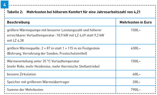In diesem Fall wären 150 m Sonde (statt 115 m), eine Verbesserung der Wärmeverteilung und ein Kompromiss bei den Zirkulationszeiten eine optimierte Lösung für die höheren Komfortansprüche. Mit Mehrkosten von 2400 Euro (700 Euro für die Wärmeverteilung; 1700 Euro für die Erdwärmesonden) wird eine Jahresarbeitszahl von 3,6 erreicht. Mit 763 Euro verbrauchsabhängigen Stromkosten ist der Vorschlag auch betriebswirtschaftlich attraktiv. Ökonomisch sinnvoll ist es in der Regel, vor allem Komponenten mit sehr langer Lebensdauer, wie Sonden und Fußbodenheizung großzügig zu dimensionieren.