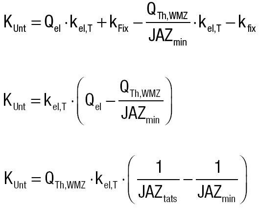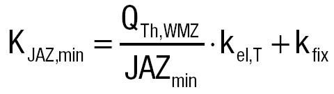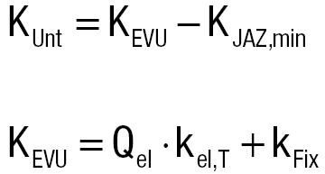 Daraus ergibt sich, dass der Unternehmer bei einer Unterschreitung der Jahresarbeitszahl die Differenz aus der Rechnung des Energieversorgers (K EVU ) und der Kosten bei eingehaltener Jahresarbeitszahl (K JAZ,min ) zu tragen hat: