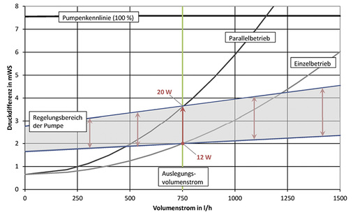 Bild 4 demonstriert beispielhaft das Dilemma des Handwerkers bei der Einstellung der Heizungspumpen für den Auslegungspunkt im Pumpendiagramm eines Heizkreislaufs. Einzel- und Parallelbetrieb sind wie oben erläutert durch verschieden steile Anlagenkennlinien charakterisiert. Eingetragen ist eine Proportionaldruckkennlinie, bei der die Förderhöhe der Pumpe, bezogen auf ihre Stutzen, linear mit dem Volumenstrom ansteigt. Für nähere Informationen zur Pumpenregelung sei auf die Literatur Wilo: Grundlagen der Pumpentechnik verwiesen. Am Schnittpunkt von Anlagenkennlinie und Regelkennlinie der Pumpe ergibt sich der Arbeitspunkt. Betrachten wir zwei Extremfälle:
