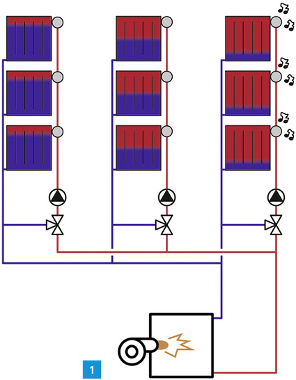 Bild 1 zeigt exemplarisch das Schema einer Heizungsanlage mit drei gemischten Heizkreisen am Heizkreisverteiler mit einem bodenstehenden Brennwertkessel ohne integrierte Pumpe. Durch die Verwendung von jeweils einer Pumpe können in den Heizkreisen unabhängige Heizkennlinien und unabhängige Zeitprogramme (z. B. Nachtabsenkung) eingestellt werden.