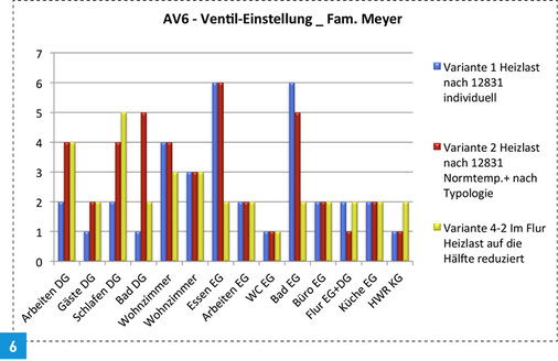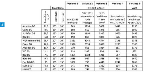 Anhand des Projekts der Familie Meyer wurden folgende Vergleichsberechnungen und Annahmen zur Ermittlung der Bezugsgröße zum hydraulischen Abgleich durchgeführt (Grafik 1 + 2). Die Auswahl der Varianten erfolgte z. T. aufgrund der am Markt üblichen Vorgehensweisen. Der Autorin ist bewusst, dass durchaus andere Varianten gebildet werden können.
