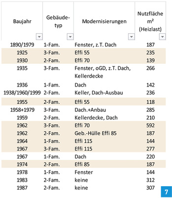 Jetzt könnte man meinen, das ist die Ausnahme, das kommt nicht immer vor. Hierzu wurden 19 weitere Projekte genauer unter die Lupe genommen. Für die Vergleichsberechnungen wurden Immobilien mit wenigen Modernisierungen bis hin zu Effizienzhäusern im Bestand ausgewählt ( Grafik 7 ). Effizienzhäuser sind nach Fachregel der VdZ immer nach Verfahren B durchzuführen. Da in der Praxis hier z.T. W/m²-Annahmen angesetzt werden, folgen die Effizienzhausvergleiche zur Erläuterung der Abweichungen.