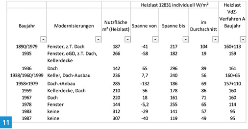 In der Übersicht der Effizienzhäuser sind diese mit den Baujahren, Nutzflächen und den beiden Heizlastberechnungsmethoden aufgeführt. Bei der Heizlastberechnung nach DIN EN 12831 Beiblatt 1 individuell ist außerdem die Spanne von dem Raum mit der niedrigsten Heizlast bis zur höchsten Heizlast/m 2 und der Durchschnittswert aller Räume genannt. Bei der Heizlast nach Verfahren A des VdZ wurden die Heizlasten nach Baujahr und nach Modernisierung ab 2009 nach Tabelle DIN EN 15378 gewählt ( Grafik 8 ).