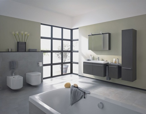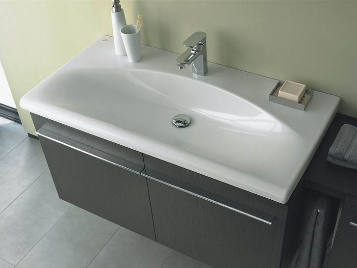 Möbeldoppelwaschtisch 130 cm, Möbelwaschtisch 100, 80, 70 cm, Einbauwaschtisch 58 cm, alle Waschtische mit verdecktem Überlaufsystem Ideal Flow, empfohlenes WC/Bidet Tonic und Moments