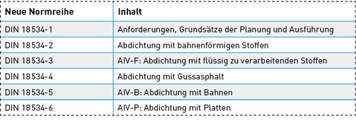Die Abdichtung von Gebäuden ( Bild 1 ) wurde im dritten Quartal 2017 mit Erscheinen der neuen DIN-Normen 18 534 Teil 1 bis 6 komplett neu geregelt. Mit der Veröffentlichung dieser Normen wurde die in die Jahre gekommene DIN 18195 nun Zug um Zug ersetzt ( Bild 2 ). Aufgrund enormer Weiterentwicklungen der Bauweisen und Baustoffe im Bereich der Abdichtung war dies dringend erforderlich. Speziell im Bereich der Innenraumabdichtung hatte sich schon seit über 20 Jahren die Abdichtung im Verbund (AIV) etabliert und vielfach bewährt. Doch die bisherige Normung kannte diese Bauweise nicht. Rein formell war sie in einigen Bundesländern sogar verboten. Somit war es höchste Zeit, diesen neuen Stand der Technik auch in den anerkannten Regeln der Technik zu spiegeln.