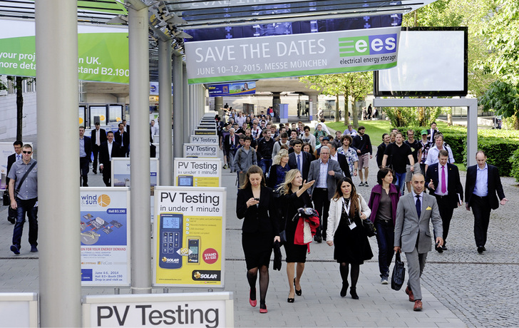 Mit rund 250 Ausstellern feierte die EES Europe im Verbund mit der Intersolar Europe bereits 2014 einen großen Erfolg. Insgesamt waren rund 1100 Aussteller auf den beiden Fachmessen vertreten. Über 26 000 der insgesamt 42 380 Besucher informierten sich über Produkte, Lösungen und Dienstleistungen rund um Energiespeicher. In diesem Jahr erweitert sich die Fachmesse flächenmäßig deutlich: Die Veranstalter erwarten eine Versechsfachung der Ausstellungsfläche im Vergleich zum Vorjahr auf rund 9000 m 2 .
