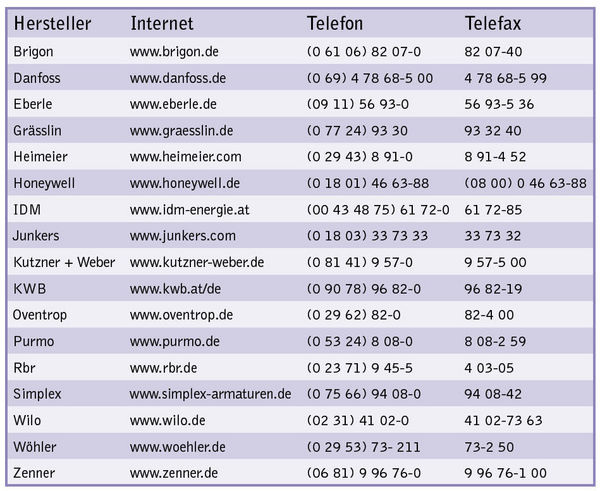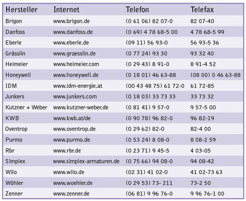 - Funk-Regelung: Heimeier hat sein Radiocontrol F-Funksystem zur Regelung von Fußbodenheizungen komplett überarbeitet, wobei es zwei Ausführungen gibt. Die 8-Kanal-Ausführung (für bis zu 8 Raumsender) bietet eine Zeitschaltuhr, Kindersicherung und sechs werksseitig vorprogrammierte Zeitprofile. Die 6-Kanal-Einheit ist eine einfachere Ausführung ohne Zeitschaltuhr für bis zu sechs Raumsender. Bei den Raumsendern hat man wiederum die Wahl zwischen der Ausführung mit und ohne Betriebsartenschalter. Für die Zentraleinheiten ist ein Stromanschluss erforderlich; die Raumsender arbeiten mit üblichen Alkaline-Batterien.