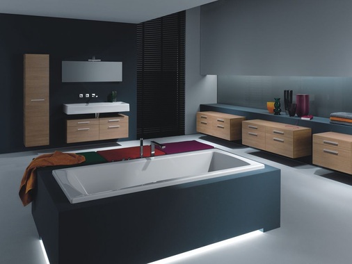 Alle Waschtisch-Varianten können mit formal abgestimmten Badmöbeln, die sowohl als Seitenschrank wie auch als Waschtischunterschrank genutzt werden können, in Mandolino-Struktur-Dekor kombiniert werden. Die dunklen Möbel setzen dadurch attraktive Akzente und einen klaren Kontrast zu den Sanitärobjekten, die in Weiß (Alpin) angeboten werden. Die puristische Wirkung wird dadurch verstärkt, dass die Waschtischunterschränke nicht direkt an die Waschtischunterseite anschließen, sondern offen und schwebend wirken. Verstärkt wird dies durch die Seitenkonturen der Waschtische, die in einer Linie mit denen der Badmöbel abschließen. Ebenfalls im Möbelprogramm enthalten ist ein wandhängender Hochschrank mit einer Tür und integrierten Glasböden. Diese Kombination unterstreicht die minimalistische Designorientierung.