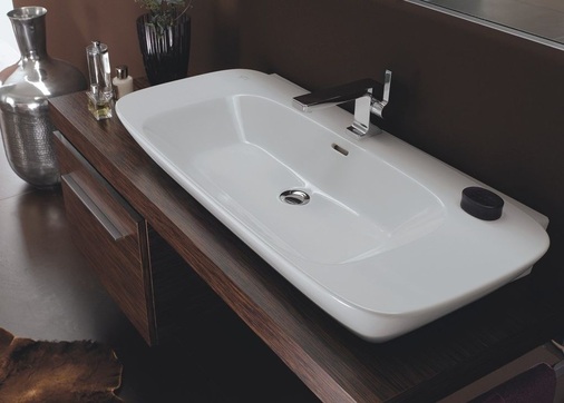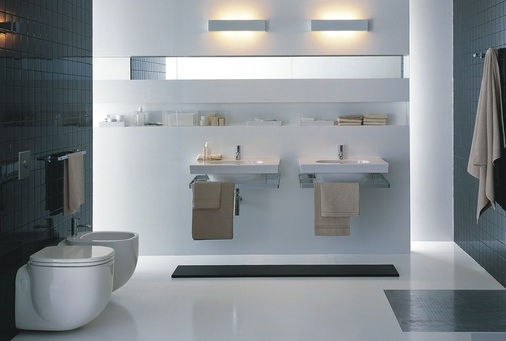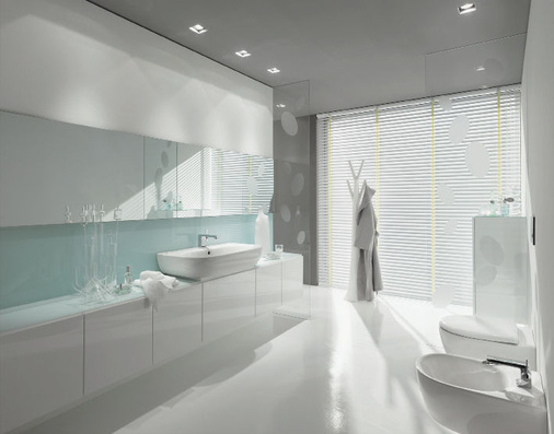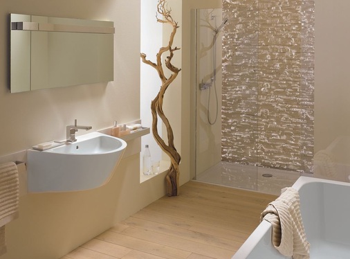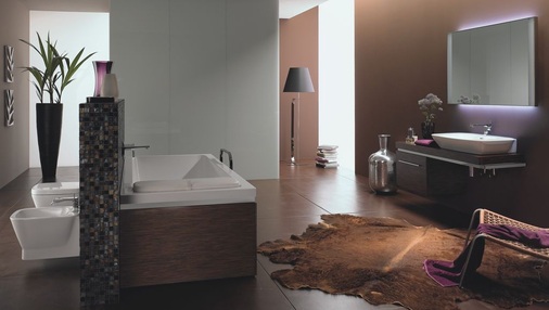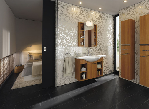 Unterstützt wird diese Philosophie durch die Kombination der Keramikelemente mit neuartigen Schmuckplatten aus hochwertigem Makassar-Echtholzfurnier oder weißem Glas. In die Platten, die optional bündig mit den Sanitärobjekten abschließen und die direkt auf der Wand aufliegen, können funktionale Accessoires sowie ein Seitenschrank mit offenem Auszug und Chromblende integriert werden. Bei dieser Anordnung ziehen sich Keramikobjekte, Möbel und Accessoires wie ein dekoratives Band durch das Bad.