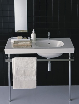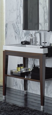 Klassisch kombiniert werden die Waschtische mit Standsäule oder den hochwertigen Möbeln aus Palisander-Echtholzfurnier und einer großzügigen Badewanne. Wird der 70-cm-Waschtisch mit einem messingverchromten Untergestell in Kreuzoptik und einem Lichtspiegelelement kombiniert, schafft er eine Atmosphäre von kühlem, modernem Luxus.