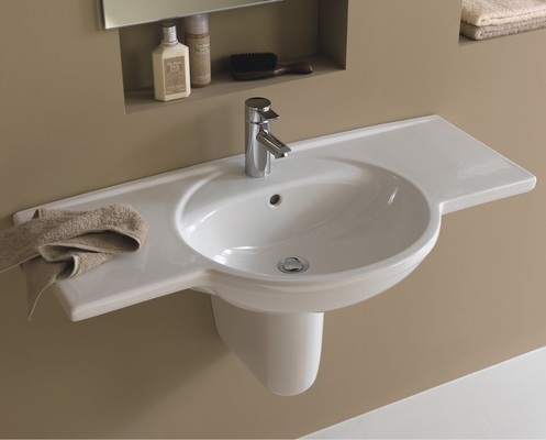 Sanitärkörper: Waschtisch 52 cm mit Ablagefläche rechts oder links, Waschtisch 60, 65, 70, 80 cm, Waschtisch 100 cm mit Ablagefläche links, alle Waschtische kombinierbar mit Halbsäule oder Standsäule, keramische Ablageplatte 44,5 x 14 cm, Tiefspül-WC wandhängend 53 cm oder 49 cm Ausladung, Tiefspül-WC bodenstehend mit Keramik-Spülkasten, Bidet wandhängend oder bodenstehend