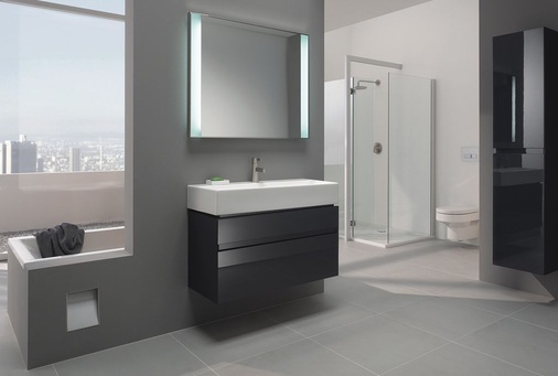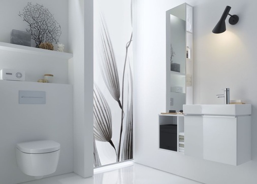 Zusätzlichen Stauraum bieten die Spiegelregale mit reduzierter Ausladung, die über den Seitenelementen oder einzeln installiert werden können. Das Lichtspiegelelement kann sowohl über dem Handwaschbecken als auch versetzt über dem Waschtisch positioniert werden. Komplettiert wird „iCon xs“ durch ein raumökonomisches Tiefspül-WC, dessen Sitz auf Wunsch mit Absenkautomatik lieferbar ist.